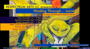 ‘Wading Through…more’ was a continuing retrospective art show of 20 years of paintings by Stephen Denman. Previously unshown paintings, the artists’ more recent paintings and write-ups about the work were added for this second weekend of the show. It was open Friday November 1st and Saturday November 2nd from 5pm-10pm. Also Open Sunday the 3rd from 1pm-5pm. The show was a part of Respectrum Arts residency at ‘For Agnes & Harriet: Creative Studio’ located at 24-28 Main Street, Sussex New Jersey, and was sponsored in part by NORWESCAP. It was FREE and open to the public.